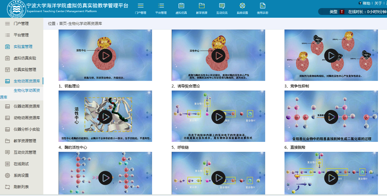 、虚拟仿真、教学资源、教研成果、教学管理、实验教学、管理制度、开放共享等栏目。虚拟仿真实验教学管理平台包括虚拟仿真实验的发布和管理;数字化教学资源管理模块;在线测试模块等。