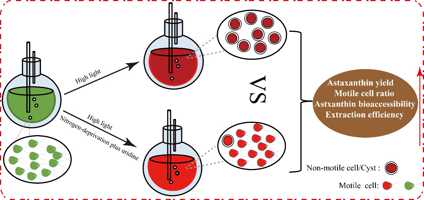 本研究中,作者发现缺氮胁迫不但能促进雨生红球藻在高光胁迫条件下积累更多虾青素,还能使大约75%的细胞由于没有合成次生细胞壁而保持游动状态。为了进一步提高游动细胞的比例,首先对缺氮处理后藻细胞的转录组进行分析,发现大量基因的表达发生了显著变化,例如虾青素合成途径基因被上调、甘露聚糖合成途径基因表达下调、嘧啶合成途径基因表达被上调。在课题组前期的研究中发现,薄壁的游动细胞中的嘧啶类化合物含量显著高于厚壁的不动细胞,因此推测高含量的嘧啶可能会抑制次生细胞壁合成。然后往培养液中分别添加不同种类的嘧啶,发现缺氮条件下外源添加0.5 mM尿苷不但可以将游动细胞的比例提高到95%,还能将虾青素产量提高26%。这些游动细胞不需要破壁处理,其虾青素的提取效率就可以达到91%-95%,是厚壁细胞的5.6-9.0倍。游动细胞也很容易被人工胃液和肠液消化。总之,本研究提高了一种联合使用缺氮和外源尿苷来生产雨生红球藻游动细胞的方法,虾青素的产量、提取效率和生物可利用度同时得到显著提升。