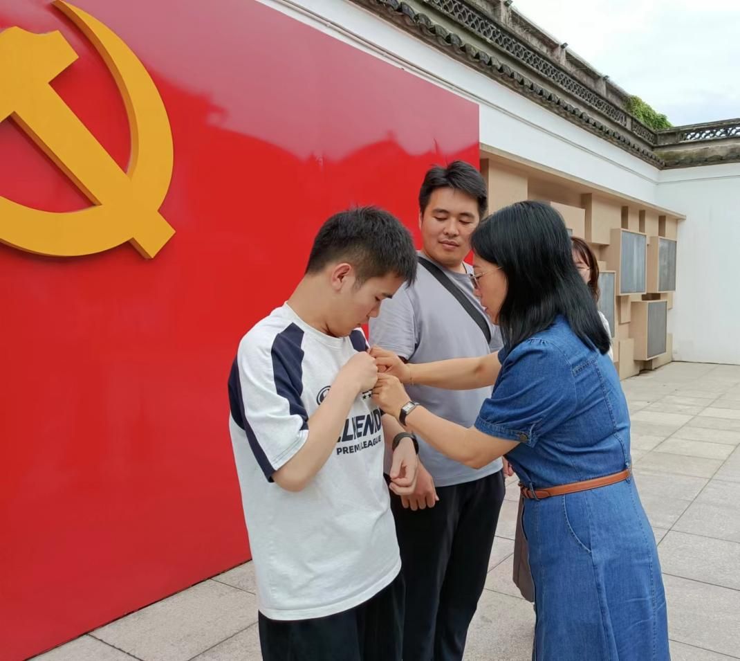 党旗前,学院党委副书记张乐老师为支部预备党员佩戴党徽。“接过沉甸甸的党徽,我深刻认识到了自己身上肩负的使命和责任。”预备党员蒋亚奇表示。