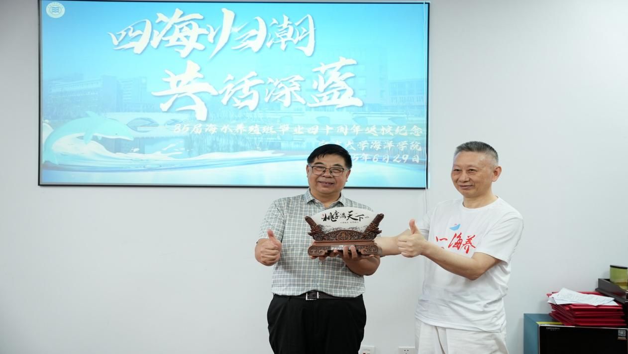 党委委员、水产学科负责人王春琳教授,党委委员、工会主席王亚军教授,地方服务中心主任唐道军老师,学工办主任王腾飞老师,校友工作辅导员林玲老师,与阔别多年的85届海水养殖班校友们共同回忆往昔、展望未来。