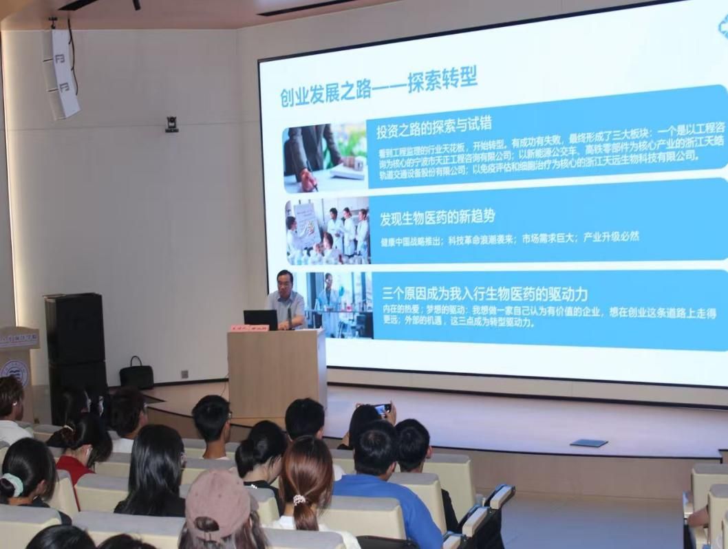 针对生物医药行业特性,黄必胜校友精准概括其“高投入、长周期、强技术”的特点:“一个项目往往需数亿元投入,从立项到上市可能耗时十年。”他以旗下天远生物在新冠疫情期间的突围为例,讲述团队一年间奔波各地,克服资金、技术、团队磨合等难题,最终攻克关键技术项目的历程。