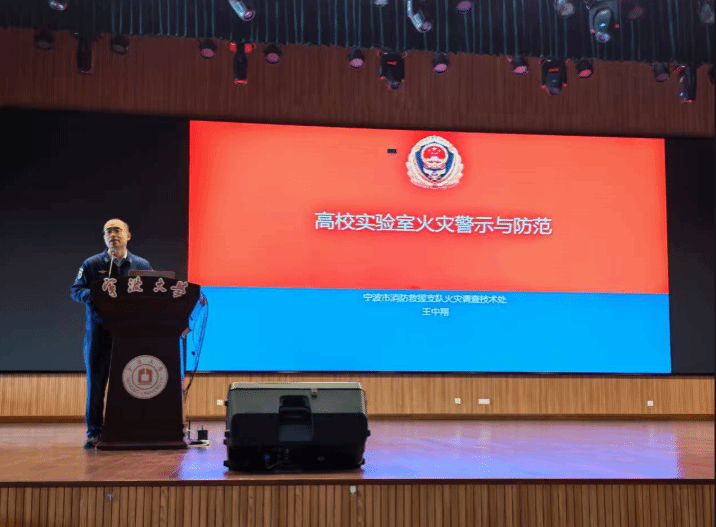 9 时 15 分,“高校实验室火灾警示与防范” 专题讲座率先在校区大会堂开讲,同步通过腾讯会议线上直播。讲座由浙江省火调专家组成员、宁波市消防救援支队火灾调查技术处中级专业技术职务王中翔主讲。作为深耕火灾调查一线的实战型专家王中翔结合 “9・29” 重大火灾、“8・11” 较大火灾等典型案例,深入剖析实验室火灾成因与防控关键,分享电器火灾 AI 辅助分析技术应用成果,并针对高校实验室常见安全隐患提出科学防范建议。其兼具专业性与实用性的讲解,为参训人员上了一堂生动的消防安全 “必修课”。