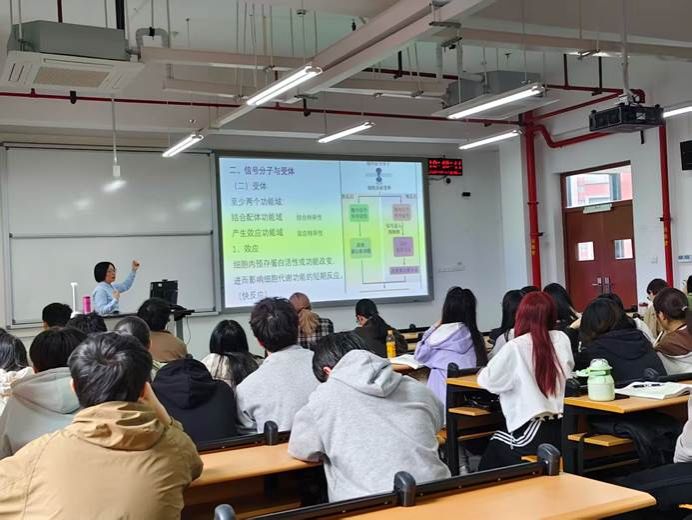 进入“细胞信号转导”核心内容后,史老师详细阐述了信号蛋白之间的级联协作机制。她借此引申出团队合作的重要性:“一个完整的信号通路需要多种信号蛋白的精密配合,任何一个环节的缺失都可能导致信号传递失败。同样,在科研攻关和社会生活中,唯有依靠团队协作,才能汇聚智慧、攻克难关。”这一讲解既深化了学生对专业知识的理解,又潜移默化地培养了集体主义精神和协作意识。