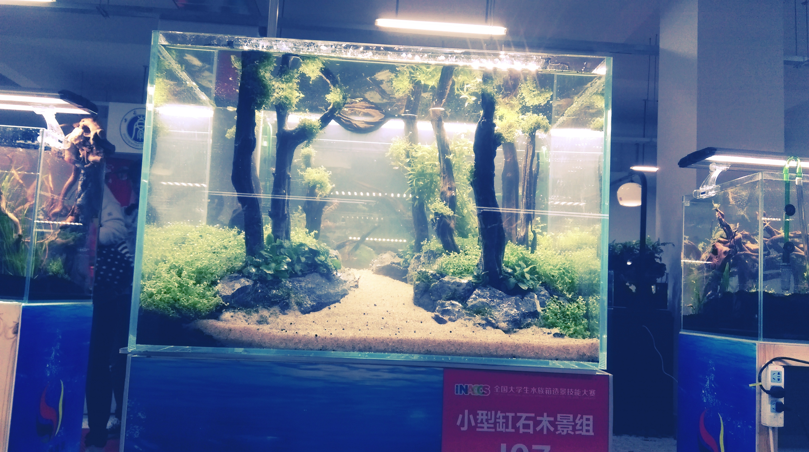 首先,比赛选手按规定领取定额代金券,挑选造景素材,随后进行景观设计,摆放石材、木材,固定水草,安装、调试设备,造景历时一天,截止晚上22:00,100支参赛队伍都在指定时间完成水族箱造景。我校王冠林、林琪创作的《丹霞幻影》中型石景缸作品喜获二等奖,作品以树化玉为主、水草为辅,着重表现了丹霞地貌的瑰丽多姿。层峦叠嶂,曲径通幽,其色如渥丹、灿若明霞;王洪斌、何晨阳、张江美共同创作的《归家》大型木景缸作品荣获三等奖,作品左右两边运用杜鹃根拼接成交错延伸的根系,蕴涵游子和家人的牵绊和顾念。远处用泰国沉木打造成连绵的树林,蜿蜒的小溪从林子尽头流出,象征思念连绵不绝以及鱼水之情,归家就如鱼对水的感激和羁绊;张泽达创作的《枕石听松》小型石木景缸作品荣获三等奖,一重境乃是取以石为基,衬垫松木之意;二重境,则是寓松木斜倚,枕靠青石之意。枕石听松,两个意象互为主体,苍松倚石,青石聆听,低声絮语。