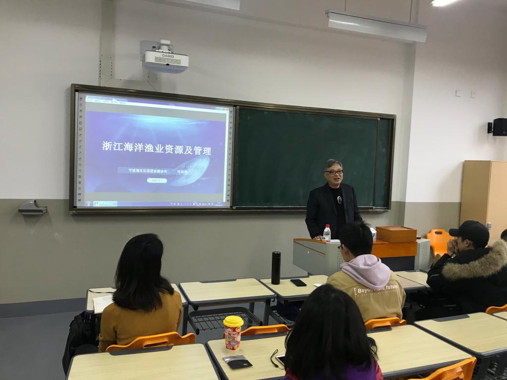 何会长从我国四大海域的渔业资源分布特点、中国四大渔场的历史渔获量变化,谈到浙江海洋渔业资源现状、浙江渔业捕捞与水产养殖产量在全国的占比份额。还着重分析介绍了浙江海域三大渔场(舟山渔场、鱼山渔场和温台渔场)以及几种主要生产作业方式。同时,何会长还从海洋渔业资源管理政策法规与资源养护措施给大家详细介绍了现行的“休渔”、“禁渔”等制度,以及设立重要水生经济动物的“繁殖保护区”、“水产种质资源保护区”、“国家级海洋自然保护区”、“国家级海洋特别保护区”、“国家级海洋公园”的重要意义。最后,何会长一再强调并勉励渔业和水产专业的同学们说:“渔业科学大有可为,国家需要你们!”
