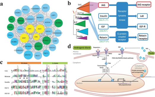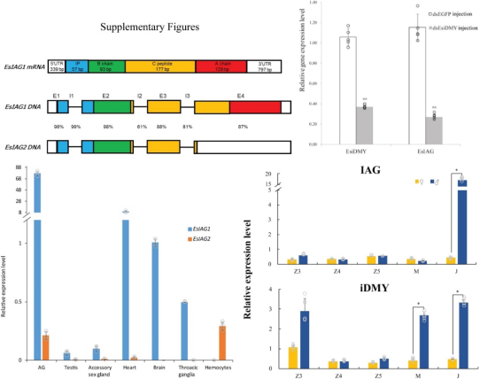 开发出河蟹性别特异性标记,解决了发育早期的性别鉴定问题。结合甲壳动物特有、负责雄性性别分化的器官-促雄性腺(AG)的多组学研究,揭示了性别关键基因IAG合成与分泌的分子调控机制,进一步确认了其上游转录因子iDMY。以上研究结果为构建性别决定通路、科学建立单性养殖技术奠定基础。