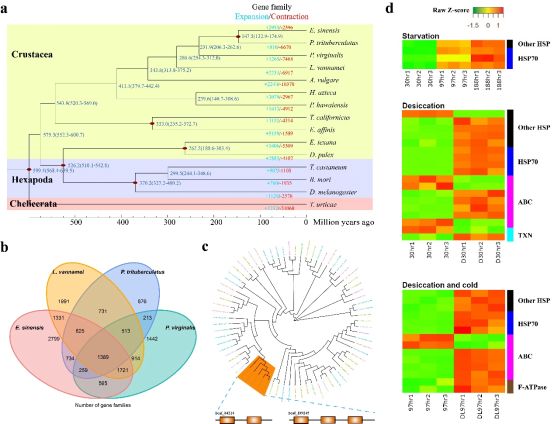 与其他节肢动物比较,中华绒螯蟹基因组中包含991个物种特有基因家族及2955个扩张基因家族。这些基因家族主要涉及热休克蛋白、氧化还原过程和大量的转运蛋白。其中,热休克蛋白70(HSP70)在基因组中显著扩张,并强烈响应了饥饿、干露、低温等耐受条件。河蟹特有基因家族和扩张基因家族的分析为进一步解析蟹类适应性进化、培育抗病抗逆新品种奠定了遗传基础。