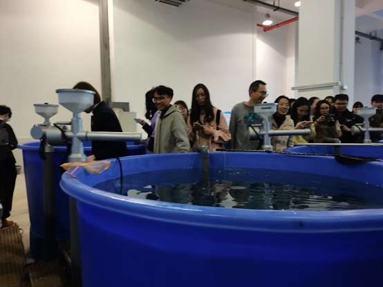 随后,一行人员参观了位于中试基地二楼的养殖场,目睹了青蟹、大黄鱼、香鱼、银鲳等的养殖环境,并走入标本展览馆进行体验