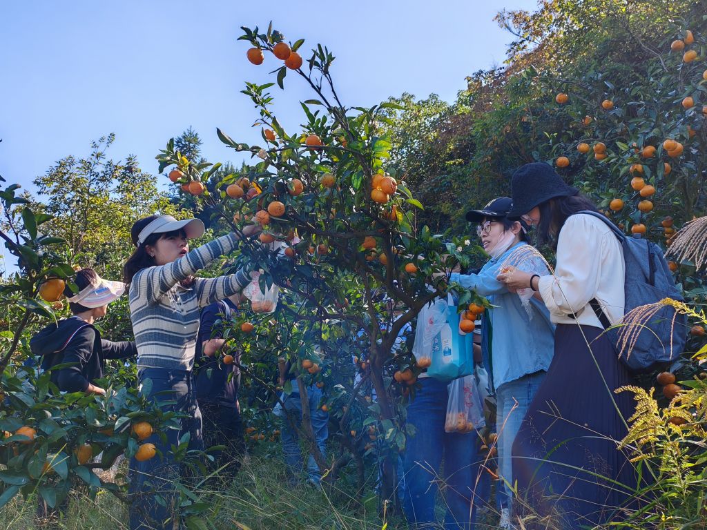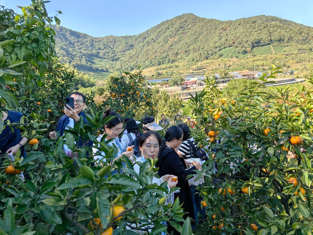 午餐后,大家在挂满了金灿灿果实的桔园里,边品尝边摘桔子,脸上洋溢着秋日收获的喜悦。