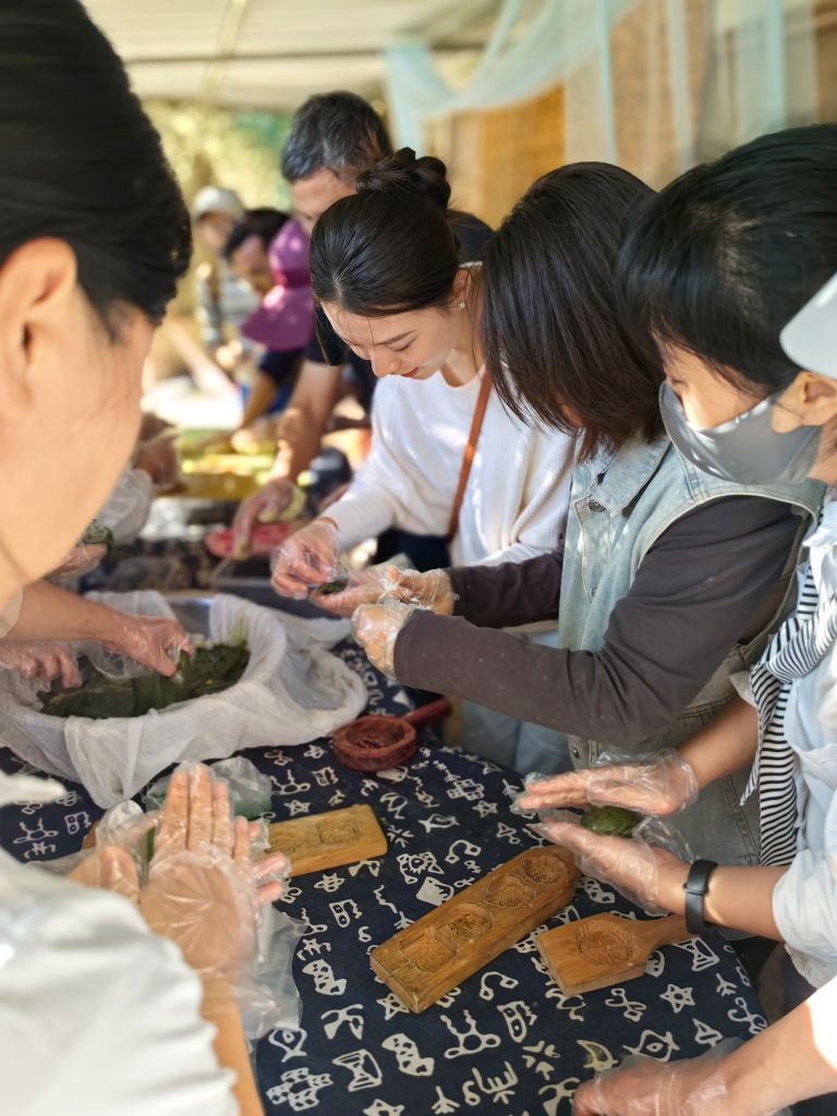 接着,大家跟着农庄的主人加入到打麻糍活动中,边听讲解边自己动手捶打、碾行,切块,包制,成型,吃着说着,一派浓浓的生活气息。