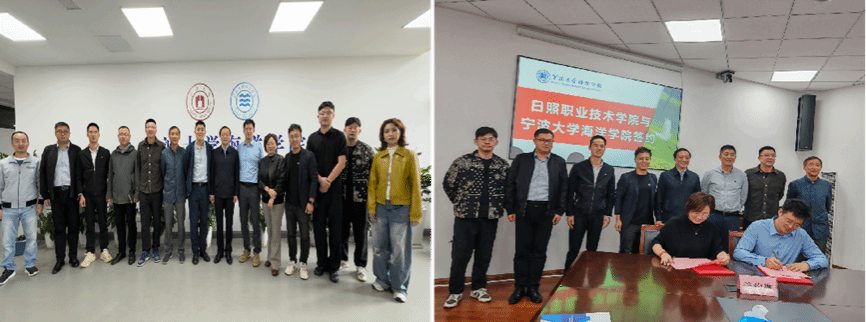 的建设成效,并全面介绍了日照职业技术学院的办学历程与发展成就,重点阐述了学校在水产养殖领域的专业特色、学生培养模式及产教研用融合战略。随后,王亚军介绍了银鲳、大黄鱼、青蟹等高价值养殖品种的研发推广情况,探讨了双方在科研成果转化等领域的合作路径。座谈期间,双方围绕人才培养模式、师资队伍建设、实训基地共建及项目合作进行了深入交流,并签署了战略合作协议。
