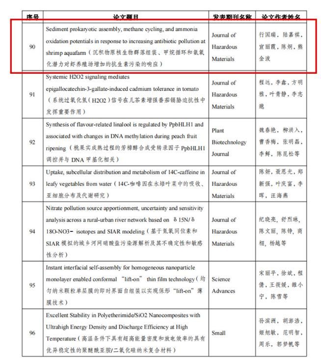 2020级渔业发展专业研究生行国瑞凭借科技和应用并重的研究成果《Sediment prokaryotic assembly, methane cycling and ammonia oxidation potentials in response to increasing antibiotic pollution at shrimp aquafarm》荣获省青年科技工作者优秀论文表彰;该论文行国瑞为第一作者,熊金波、陈炯研究员为通讯作者。