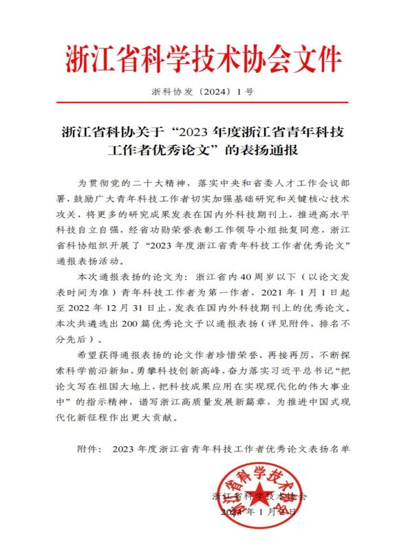 近日,浙江省科协宣布了“2023年度浙江省青年科技工作者优秀论文”的遴选结果,并对获奖者发出表扬通报。此次评选共有200篇论文(含CNS正刊44篇)脱颖而出,其中成人小说