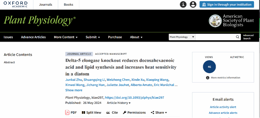 姜海波教授团队与中国农业科学院油料作物研究所龚阳敏副研究员课题组合作,针对海洋硅藻三角褐指藻长链多不饱和脂肪酸合成通路及其对高温生理响应开展了深入研究,研究成果以“Delta-5 elongase knockout reduces docosahexaenoic acid and lipid synthesis and increases heat sensitivity in a diatom”为题在植物学领域权威期刊《Plant Physiology》上发表(图1)。