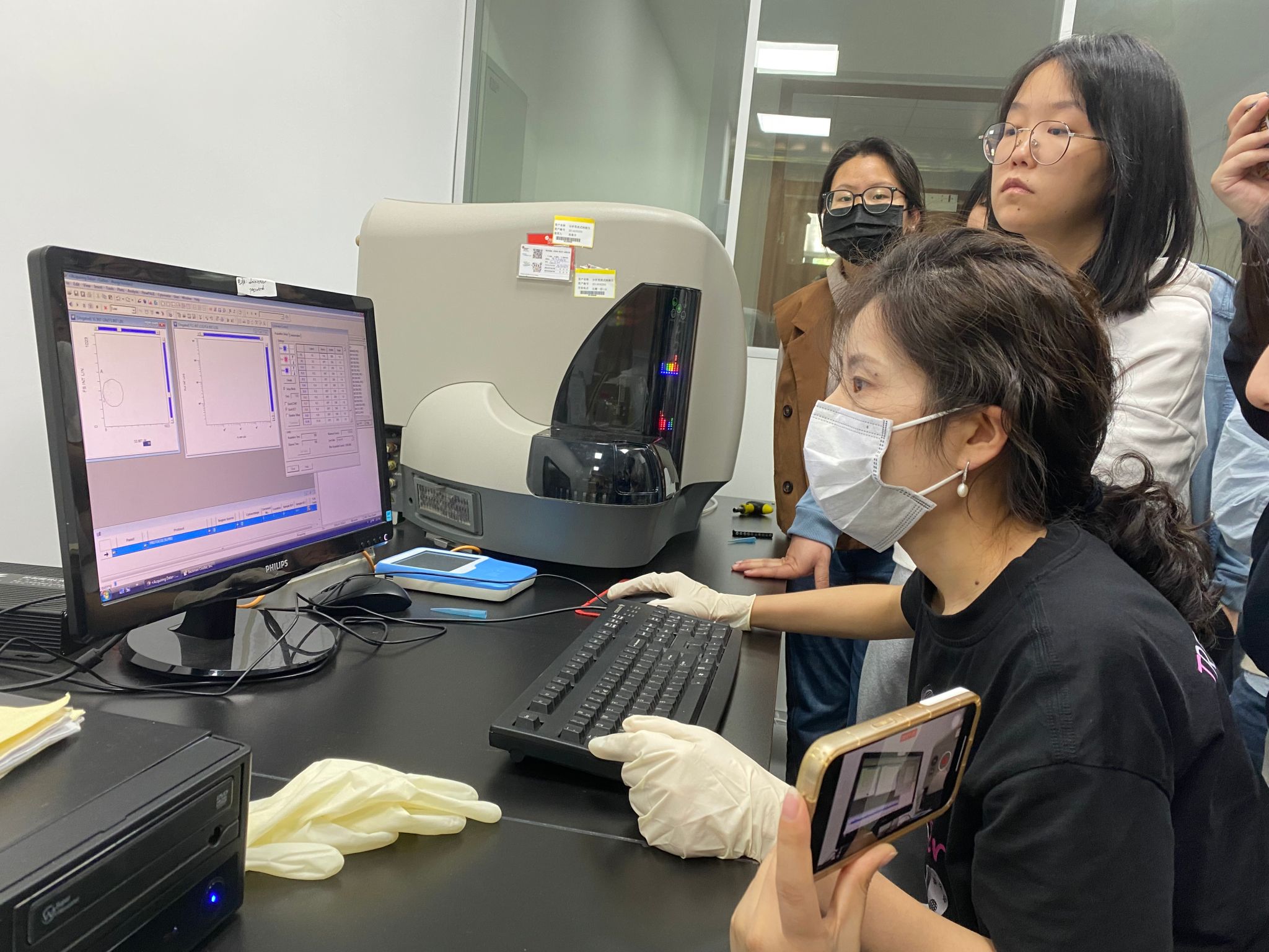 培训中,陈工程师详细地介绍了分析型流式细胞仪的使用原理及应用,并对Gallios使用方法、画门依据,调电压的方法,以及用密度图、散点图、直方图对不同数据的展示方式进行了讲解及演示,并针对线粒体膜电位、重组藻的荧光值测定等师生自备实验样品进行了现场参数调节,解答了师生们提出的各种实验问题,同时强调了仪器使用注意事项。